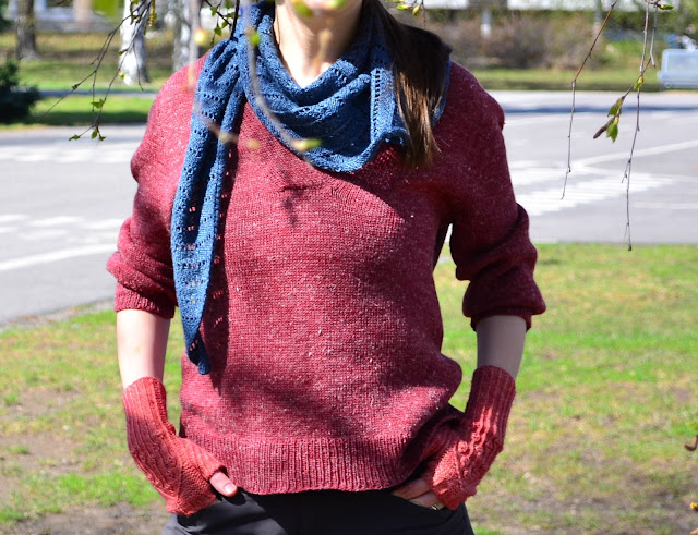 Ennen puseron kastelua epäröin helman pituutta. Neuloin sen ohjeen mukaiseen pituuteen kierrosmääriä laskien. Sovitettaessa pusero vaikutti napapaidalta. Päätin luottaa ohjeeseen, ja viimeistelin puseroni kastelemalla. Se kannatti. Puseron koko muuttui huomattavasti. Sekä pituutta että leveyttä tuli reilusti lisää. Aurinko-puseroni valmistui lumituiskujen keskelle, joten sopivaa kuvaussäätä piti odotella. Tykkään lopputuloksesta. Näin kasteltuna helman ja hihojen mitta on käytännöllinen. Ja tuntuma päällä on ihanan kevyt. Mutta selkeästi vierastan avaraa kaula-aukkoa, koska kaipaan sen kanssa kaulahuivin.